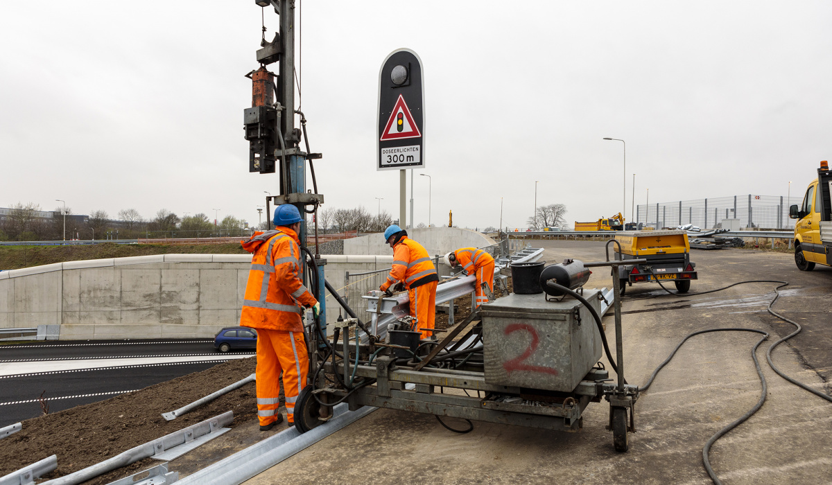 Het aanleggen van tijdelijke en definitieve wegen bestond uit meer dan alleen veel asfalt draaien. Team Grond- Weg- en Waterbouw (GWW) werkte voor het tijdelijke en definitieve wegenwerk dan ook nauw samen met team Verkeerstechniek (VTI), dat aan de lat stond voor onder andere het plaatsen van vangrails, verlichting, portalen met bewegwijzering en de verkeersregelinstallaties met bijbehorende kabels en spanning.